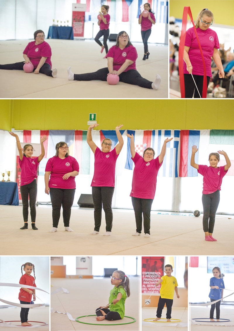 L’ultima esperienza di cui vi vogliamo raccontare riguarda un progetto di inclusione che ha visto coinvolto un piccolo gruppetto di allievi di 4/5 anni della scuola dell’Infanzia Statale di Feletto U. Gli stessi allievi avevano partecipato insieme a tutti i compagni della scuola al progetto “ASU per le scuole”, svolto nell’a.s. 2015/2016 che offriva un ciclo di lezioni gratuite di giocaginnastica per tutte le sezioni aderenti. I bambini, le cui famiglie hanno dato la disponibilità, seguiti sempre dall’insegnante Sharon Fabris, si sono ritrovati durante il periodo estivo per una serie di incontri gratuiti. In queste lezioni, le attività proposte hanno spaziato da percorsi strutturati all’utilizzo degli attrezzi presenti in palestra (trampolone, travi, etc) e all’uso di uno dei piccoli attrezzi tipici della ginnastica ritmica (nastro); nei percorsi sono stati inseriti oltre gli schemi motori di base, anche la propedeuticità di alcuni degli elementi artistici quali capovolte avanti e indietro, ruote e verticali, per guidare i bambini alla scoperta di loro stessi e del variegato repertorio di movimento del corpo umano.